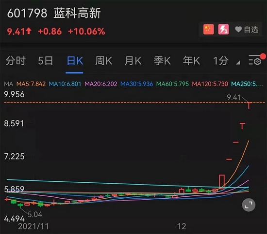 12月15日,沪市主板公司蓝科高新再度强势涨停,这是该股近期收出的第5个涨停板,短短五个交易日,该股从5.84元飙升至9.41元,累计涨幅达61.13%。