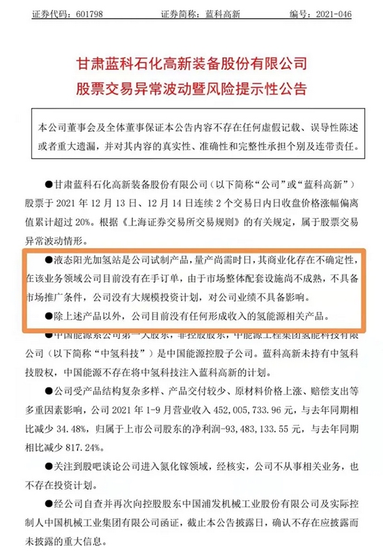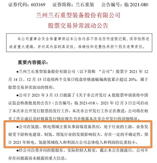 同样发布了股票交易异常波动公告的兰石重装则表示,预计2021年核电、氢能领域收入和利润占公司总体收入和利润的比重较小。