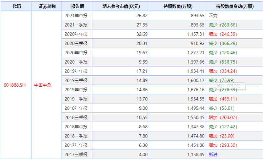 此外,中国中免实际上是该基金一直重仓持有的股票,该基金在2020年一季度、二季度和三季度均大量减持了中国中免,2020年四季度减持246.39万股后,2021年一季度又减持了263.66万股。今年二季度期间,该基金持有中国中免仓位未变,但三季度该基金因减持退出了中国中免前十大股东名单。