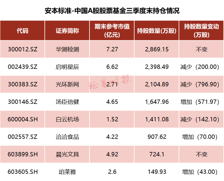 值得一提的是,除了上述持仓外,三季末,安本标准-中国A股股票基金还持有启明星辰、光环新网、汤臣倍健、白云机场、洽洽食品、晨光文具、珀莱雅等股票。