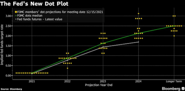 《经济摘要预测》(SEP)中的“点阵图”(dot plot)还显示,FOMC成员预期2022年和2023年各加息3次。根据联邦基金利率期货,市场已经闻讯计入明年4月会议加息1次的几率为75%、5月会议加息1次的几率为100%。截至记者发稿,比例还在增长。
