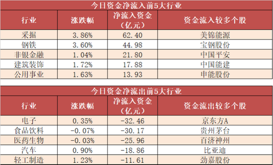 今日,资金集中流入周期股,其中采掘行业净流入62.4亿元居首。