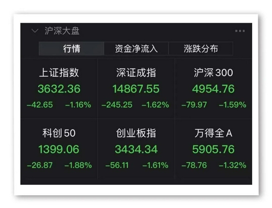 据Wind数据显示,截至12月17日收盘,上证指数下跌1.16%,报3632.36点;深证成指下跌1.62%,报14867.55点;创业板指下跌1.61%,报3434.34点。