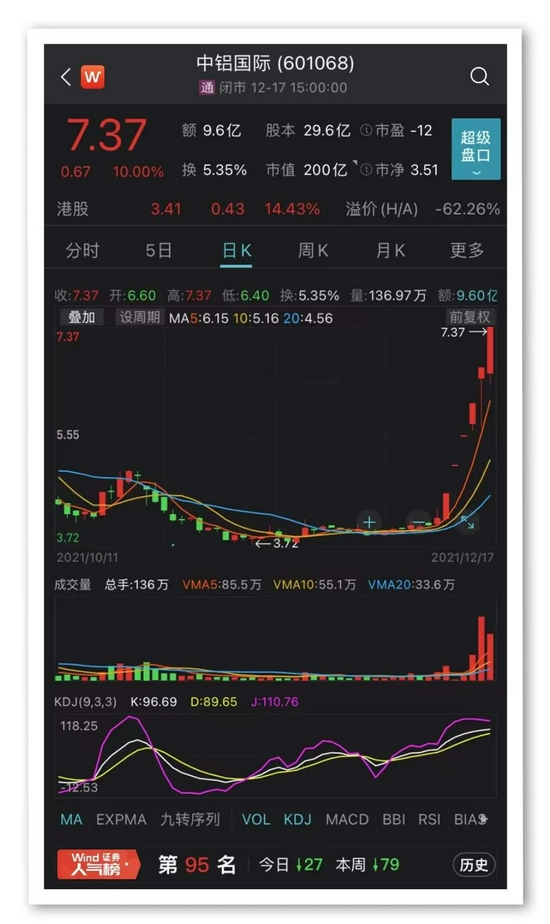 此外,200亿元市值的中铝国际今日收下第6个涨停板,报7.37元。中铝国际的这波上涨行情始于本月9日,若以12月8日收盘价计算,短短7个交易日,累计涨幅达81.98%。