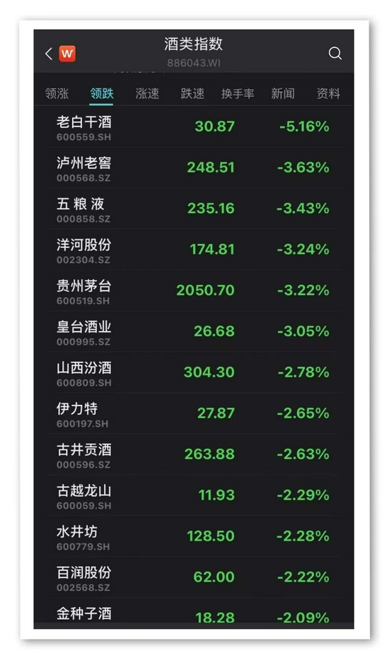 酒类方面,老白干酒跌超5%,除3713亿元市值的山西汾酒跌2.78%之外,板块内2000亿元以上市值的贵州茅台(市值25761亿元)、五粮液(市值9128亿元)、泸州老窖(市值3640亿元)、洋河股份(市值2634亿元)跌幅均超3%,皇台酒业(维权)亦跌超3%。
