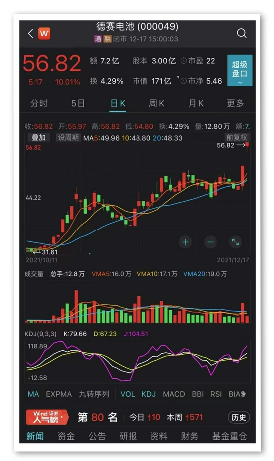 继12月16日收获涨停之后,12月17日德赛电池再度涨停,报56.82元/股,创该股上市以来新高。截至收盘,该股总市值达171亿元。