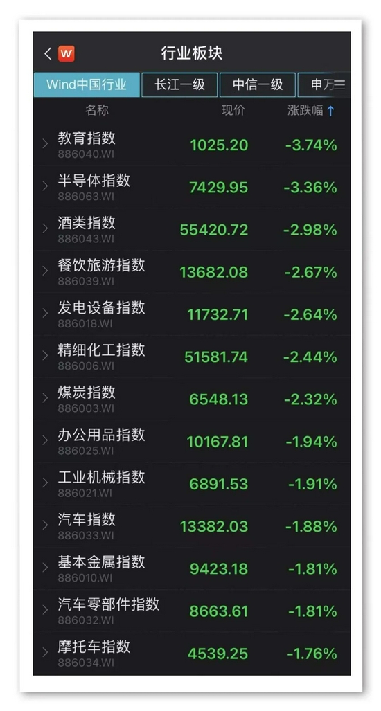 从盘面上看,Wind数据显示,教育、半导体、酒类、餐饮旅游等板块跌幅居前。