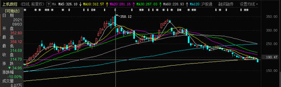 K线图数据显示,自9月3日,上机数控走出年内高价358.12元以后,股价就进入了回调通道。特别是近期以来,上机数控股价多数呈现阴跌状态。3个月左右时间,上机数控股价累计跌幅达48%,总市值缩水超460亿元。