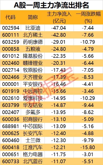 数据宝统计显示,除去近一月上市新股,多达26股净流出额逾10亿元。新能源车、锂电等产业链延续上周资金大幅流出态势,主力集体出逃比亚迪、赣锋锂业、华友钴业、长安汽车等龙头个股。其中,比亚迪继上周主力净流出24.99亿元后,本周金额再度放大,高达47.04亿元;第二位的北方稀土本周净流出额42.8亿元。该股已连续三周遭主力卖出,累计净流出额近80亿元。
