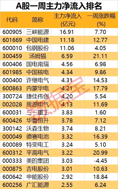 净流入方面,仅三峡能源、中国电建、包钢股份获主力逾10亿元加仓。从行业来看,本周电力及电气设备相关能源股明显获得资金青睐,三峡能源、中国电建、国电南瑞、许继电气等净流入额居前。值得一提的是,本周白酒股遭主力大幅抛售;五粮液中止连续四周加仓,一周净卖出24.8亿元;洋河股份、山西汾酒等净流出额也均在10亿元以上。