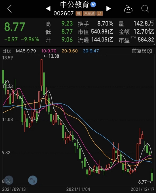 受信披违规以及另一则股东持股质押利空影响,中公教育今日跌停,收报8.77元/股,总市值540.88亿元,较2020年11月高点市值蒸发逾2100亿元。该股在2018-2020年期间,股价累计涨幅一度达到10倍。而近一年来,股价跌幅则近80%。值得注意的是,公司11月30日才刚因为未按规定履行审批程序及信息披露义务而收到安徽证监局警示函。截至今日,中公教育仍有13.2万股东。