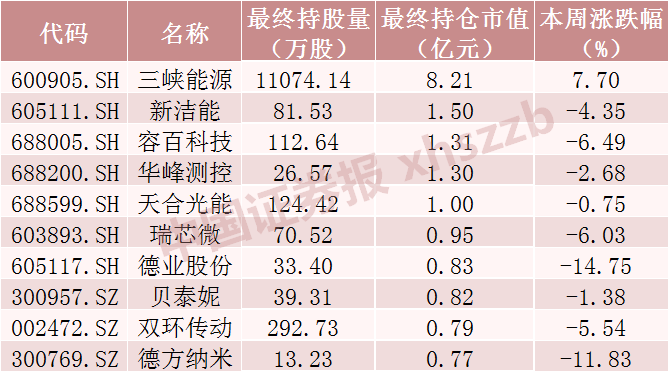 从市场表现来看,北向资金对新纳入股票持仓市值居前十的股票中,三峡能源本周上涨7.70%,其他股票均下跌,德业股份、德方纳米跌幅超11%。