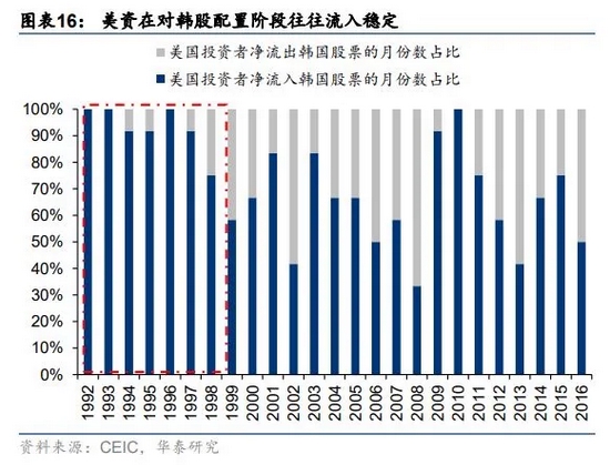 1)外资对A股尚处于配置阶段,2018年底,外资占A股市值仅1.58%。对标韩国股市,其自开放外资起,至1999年外资在韩国股市市值占比达18.5%之前,以美国为代表的外资资金流入节奏都相对稳定,未出现连续大量的资金流出。可见尚处于配置过程中的外资流入行为或不会受到其他因素过大的干扰。