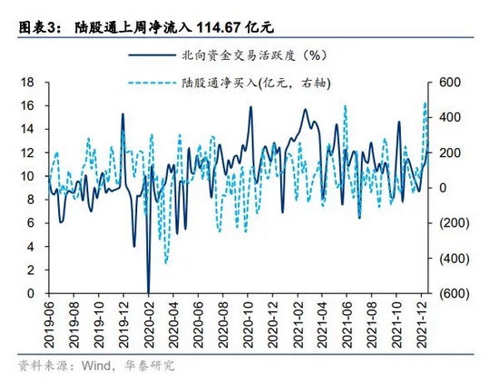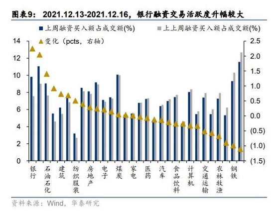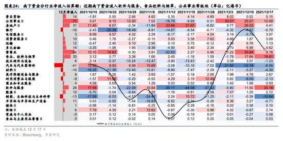 不过,12月以来,北向资金交易活跃度有所上升,而明年美联储加速收水,香港融资成本或会抬升,可能导致北向资金交易活跃度下降,市场担忧是否会对A股产生联动效应。以交易额占整个板块成交额计,我们观察到,过去两周杠杆资金较为活跃的板块为非银金融、钢铁、综合金融、煤炭、有色金属板块,而北向资金成交较为活跃的板块为消费者服务、食品饮料、银行、电新、非银金融等。两者的重合度并不高,北向资金变化可能带来的联动效应或也有限。