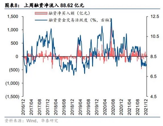 两融资金:上周两融资金成交占两市总成交额比重为7.74%,两融余额18499.78亿元,均较上一周小幅提升。分行业来看,上周银行(+2.25pts)、综合金融(+2.04pts)融资交易活跃度升幅较大,非银行金融(-1.11pcts)、钢铁(-0.99pcts)融资交易活跃度降幅较大。