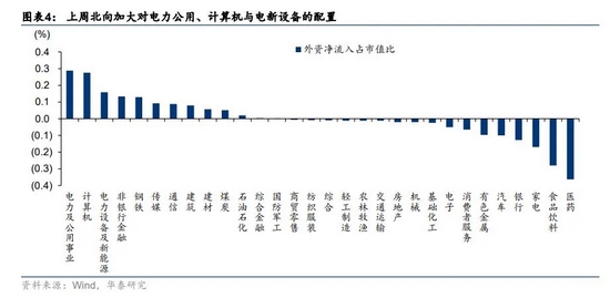 北向资金:上周北向资金先扬后抑,全周净流入114.67亿元,较上上周的488.34亿大幅回落。结构上,以净流入占市值变化计,北向上周加大了对电力公用(+0.29%)、计算机(+0.28%)、电新设备(+0.16%)等板块的配置。不过,从过去一周行业表现来看,板块表现较佳的为传媒、电力公用和煤炭,反映出内外资在配置上存在部分分歧。