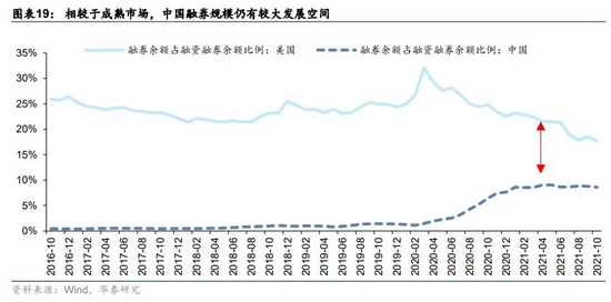 考虑到成熟市场中融券余额占两融存量近20%的水平(10月美国融券余额占两融余额17.6%),我国融券规模尚有较大发展空间。