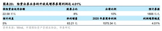 证券:增厚利润,头部券商更加受益。如前所述,基准情形下,险资可为市场带来1806亿券源,假设长期利差为5%左右,则证券业利息净收入可增加90.3亿元,税后约为券商利润增厚达4.01%(以2020年净利计)。尤其是融资融券业务较为发达的头部券商有望借助雄厚实力率先构筑竞争壁垒,或更加受益。