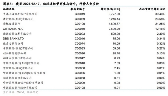 1)从量上来看,内地投资者在香港开立证券账户以及北向交易权限,通过陆股通交易A股的规模并不大。据证监会数据,该类投资者数量约有170万,但近三年有交易记录的仅3.9万,交易金额在北向交易中占比也仅有1%。从实际持股数据上来看,外资也占到了陆股通托管商参与者(C类编号)持仓的大多数,内资托管商持仓少之又少。