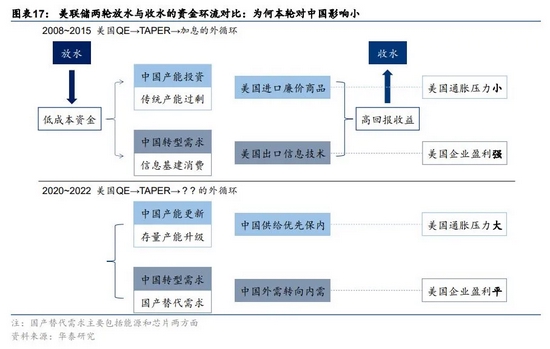 更长期而言,正如我们在2021.11.12《2022:配置能源与芯片的增长闭环》中所指出的,本轮QE-Taper-加息的全过程难以形成像上一轮美元宽松,全球低成本资金推动一轮中国产能扩张、一轮中国地产周期、一轮中国消费升级;美元回收,低价进口商品(中国产能扩张)、高资本回报(中国地产周期)、高出口利润(中国消费升级)回流美国这样清晰的美元闭环。本轮中国产能投资更多为存量产能的更新升级,优先保内,转型需求为能源和芯片的国产替代,主要提升的也是国内企业盈利而非美国企业。因此,即便目前美联储已经较预期加快推进Taper进程(加息是否加速则仍取决于市场反馈机制),因A股本身的内生性更强,对其估值影响也明显小于上一轮。
