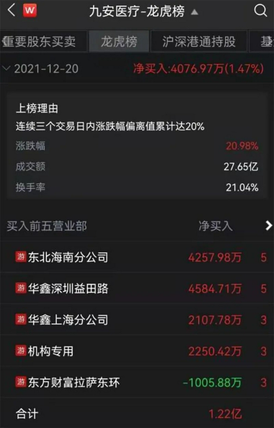 12月20日,九安医疗再度登上龙虎榜,其中机构席位净买入2250万元。