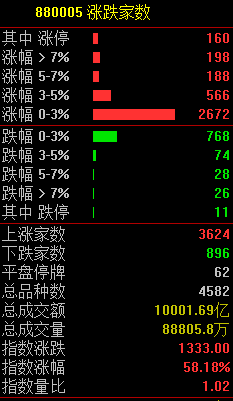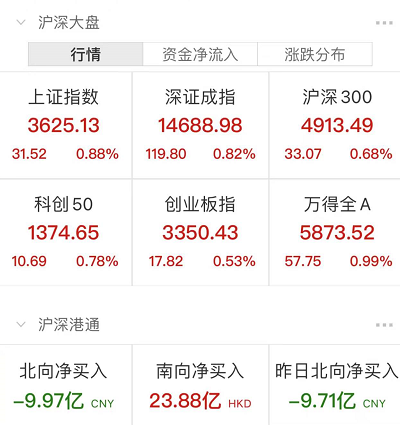 截至收盘,沪指涨0.88%报3625.13点,深成指涨0.82%报14688.98点,创业板指涨0.53%报3350.43点;两市合计成交10004亿元,北向资金净卖出9.97亿元。