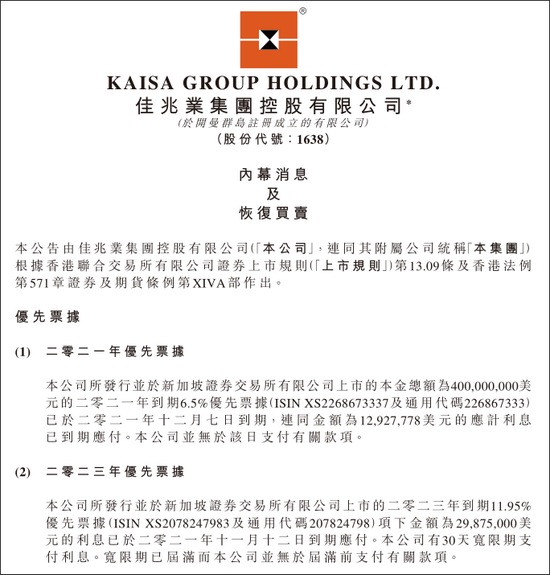 佳兆业在公告中称,未就优先票据的付款情况可能导致佳兆业的债权人要求加快还款。截至公告日期,佳兆业还未接获该公司发行的优先票据的持有人就加快行动发出任何通知。