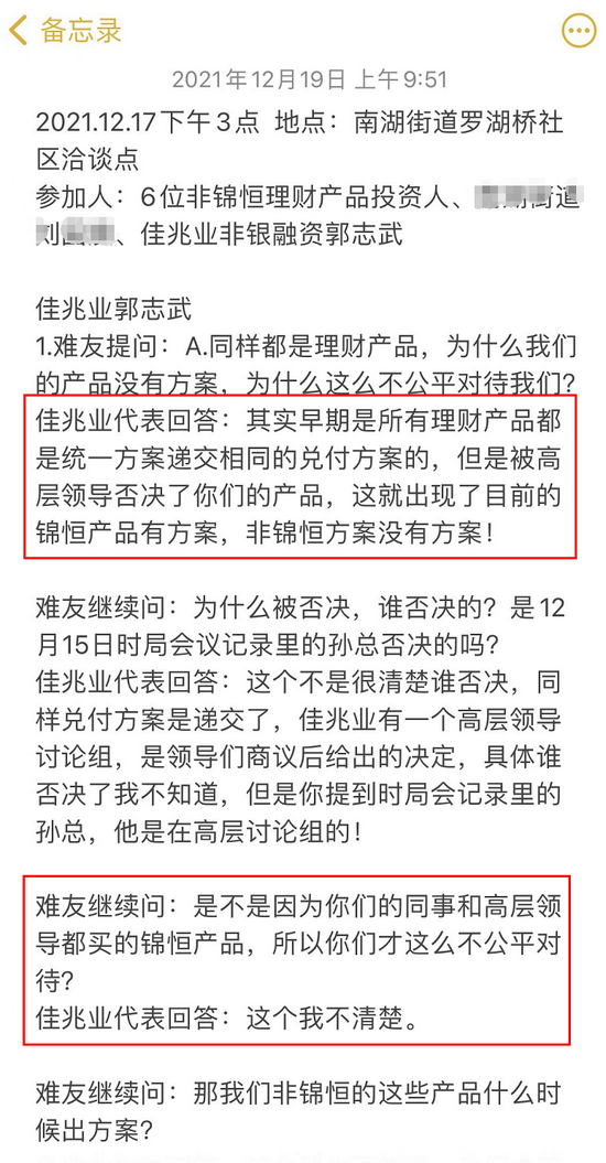 12月17号几位非锦恒的投资者代表去罗湖桥社区工作站和佳兆业工作人员面谈,从其提供的记录中,目前非锦恒的40亿理财产品并没有兑付方案。
