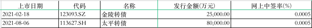 太平转债、金陵转债网上中签率均为0.0005%,可谓“二十万里挑一”,成为今年上市发行最“抢手”的可转债。