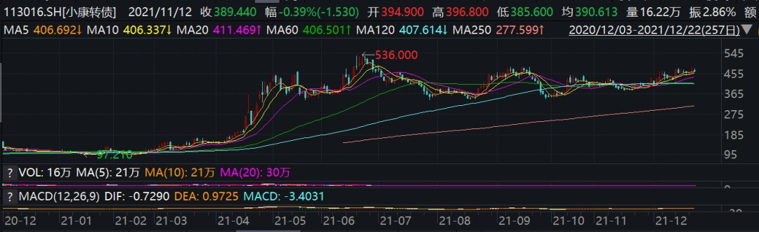 以振幅衡量,2021年,哪只可转债的走势最为惊心动魄?仍然是小康转债。该转债1月14日最低价为97.21元,此后逐渐攀升,于6月23日达到536元的年内最高点,此后几经沉浮,年度振幅达396.2%。