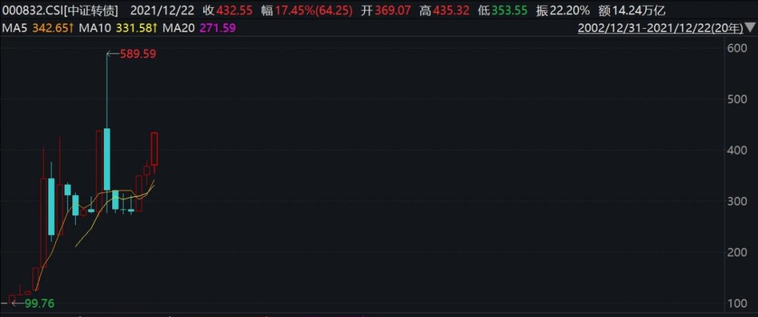 截至12月22日上午收盘,中证转债今年以来涨幅为17.45%,远高于上证指数4.39%、深证成指2.20%的今年涨幅。与纯债相比,中债-新综合财富指数年涨幅约4.72%,可转债同样遥遥领先。若非月内出现一波回调,超越商品指数也不是难事。