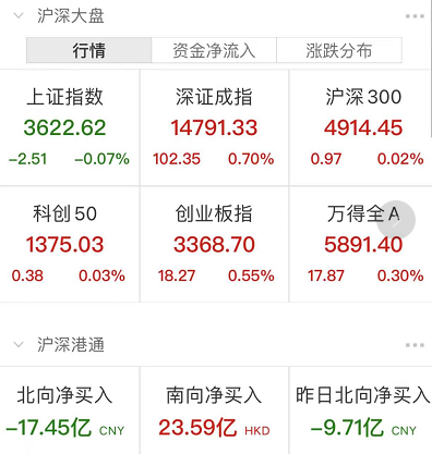 截至收盘,沪指微跌0.07%报3622.62点,深成指涨0.7%报14791.33点,创业板指涨0.55%报3368.7点;两市合计成交10625亿元,北向资金今日全天净流出17.45亿元,连续4个交易日净流出,其中沪股通净流出17.06亿,深股通净流出3851万。