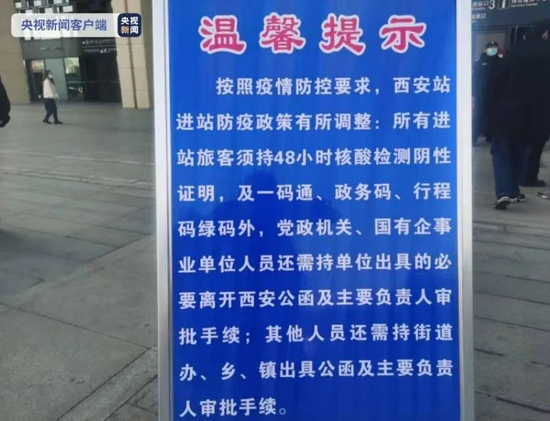 即日起,从西安火车站、西安北站乘车离开西安的人员,除必须持有48小时核酸检测阴性证明及一码通、政务码、行程码绿码外,党政机关、国有企事业单位人员还需持单位出具的必要离开西安公函及主要负责人审批手续;其他人员还需持街道办、乡镇出具的公函及主要负责人审批手续。