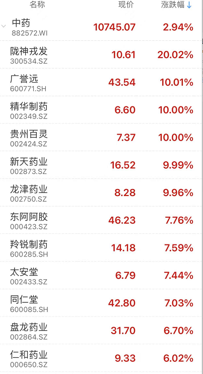 中药为代表的医药股集体走强,陇神戎发20CM涨停实现3连板,万邦德、广誉远、贵州百灵、精华制药、新天药业、龙津药业涨停。