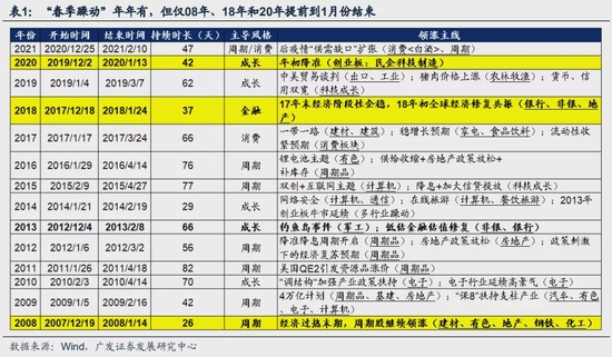 ●“可为阶段”也是逢低布局“春季躁动”的机会。近期投资者对“春季躁动”的关注度明显增加。经验数据显示:过去10多年“春季躁动”年年都有,大多在2月及以后才会结束,仅08/18/20年“春季躁动”在1月中下旬提前结束,均遭遇了重大“不确定性”事件冲击。我们判断当前“春季躁动”有支撑:“稳字当头”政策主线、MLF调降预期。