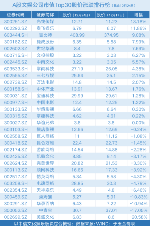 12月24日A股市场集体高开,但沪深两市很快下挫,早盘呈现单边下跌的走势。午后,两市依旧保持弱势震荡的格局,全天看,A股三大指数集体下挫,创业板指数更是跌超2.2%。花开两朵,各表一枝,文娱概念股本周(12月17日-12月24日)则呈现出两级分化之势。