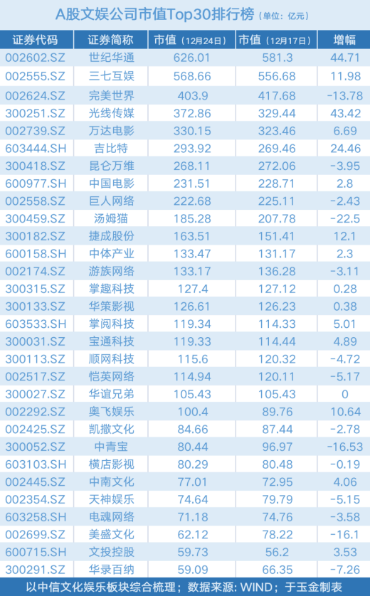 具体来看,在A股市值TOP30的文娱概念股中,除华谊兄弟(300027.SZ)涨跌互现后与上周持平外,15家公司股票、市值上涨,14家公司反之,其中世纪华通(002602.SZ)市值增长44.71亿元,为本周增幅最多的公司,站在另一段的是汤姆猫(300459.SZ),市值下滑22.5亿元;股价方面,光线传媒(300251.SZ)则以股价上涨13.18%成为本周股价上涨最多的公司,而在上周表现凶猛的美盛文化本周掉头直下,股价下滑20.58%。
