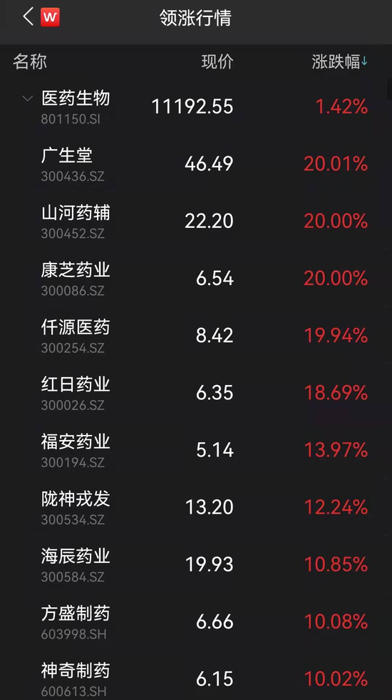 尽管医药生物板块整体涨幅仅为1.42%,但其成分股中却有相当一部分个股涨停。