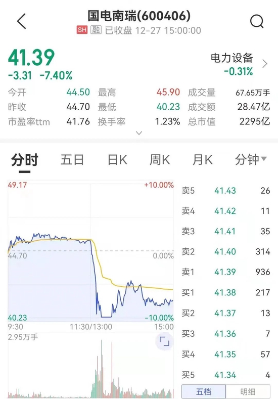 截至27日收盘,国电南瑞下跌7.4%至41.39元,市值为2295亿元,单日蒸发183.5亿元。
