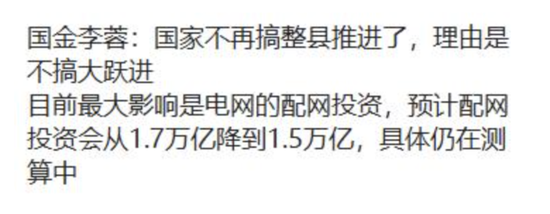 今日,在各大分析师群中流传的分析师观点搅动了市场。据消息称,“国家不再搞整县推进了,理由是不搞大跃进”、“国金证券李蓉表示,国家不再搞整县推进了,目前影响最大是电网的配网投资,预计配网投资会从1.7万亿降到1.5万亿,具体仍在测算中”。