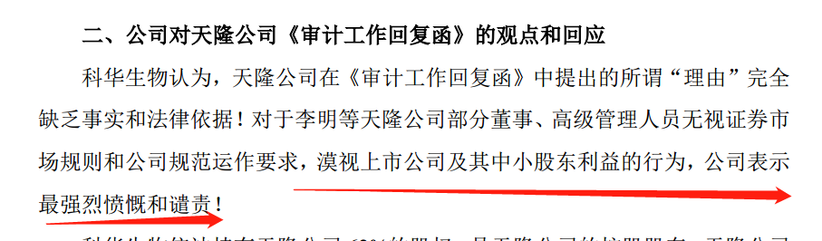 公司认为,天隆公司在《审计工作回复函》中提出的所谓“理由”完全缺乏事实和法律依据!对于李明等天隆公司部分董事、高级管理人员无视证券市场规则和公司规范运作要求,漠视上市公司及其中小股东利益的行为,公司表示最强烈愤慨和谴责!
