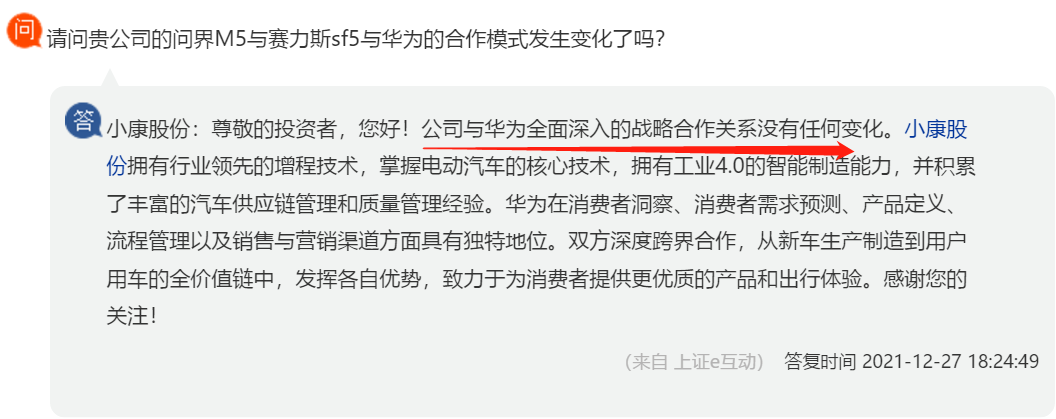 面对这三日大幅异动,小康股份昨日在投资者互动平台表示,公司与华为全面深入的战略合作关系没有任何变化。双方深度跨界合作,从新车生产制造到用户用车的全价值链中,发挥各自优势,致力于为消费者提供更优质的产品和出行体验。