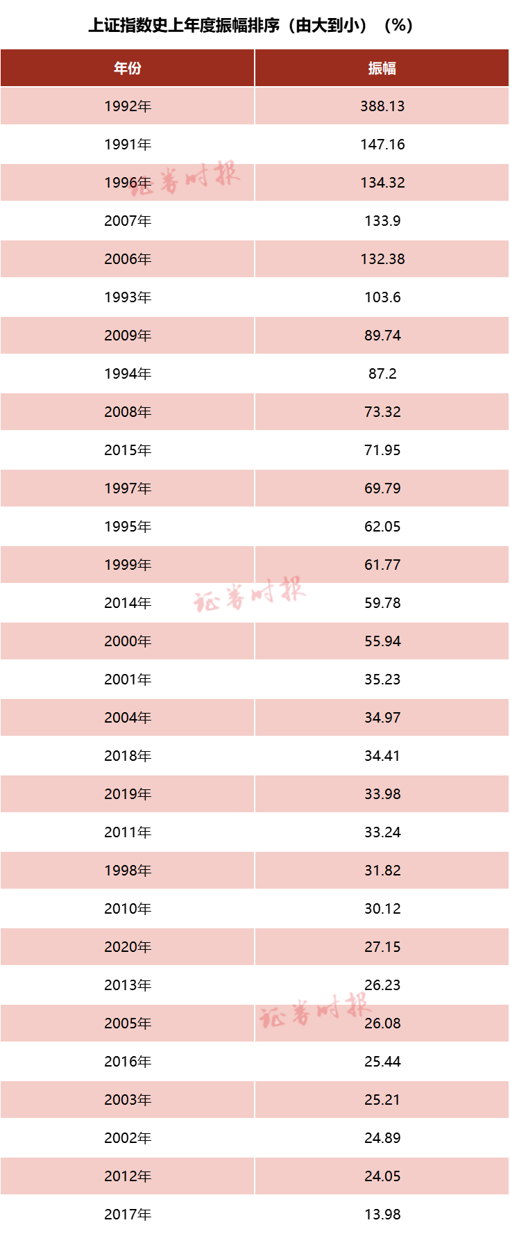 在此之前的年份中,振幅最低的是2017年,当年上证指数振幅为13.98%。