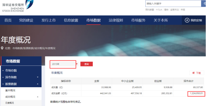 另据沪深交易所披露数据,2015年,沪市年度累计成交额为132.56万亿元(注:其中沪市主板A成交132.32万亿元,沪市主板B成交0.24万亿元),当年度深市累计成交额122.495万亿元,据此计算,当年两市合计成交255.05万亿。