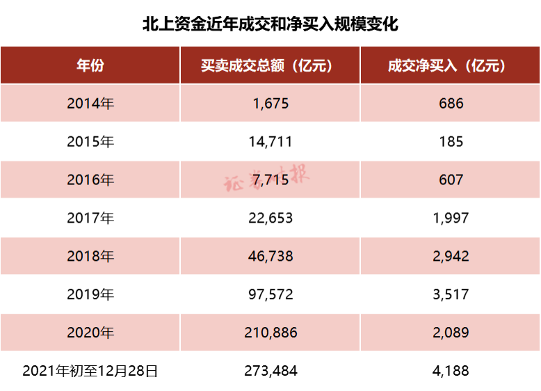 统计数据显示,2021年初至12月28日,北上陆股通资金累计成交总额已超过27万亿元,这一成交规模不仅超过2020年全年的21万亿元,更是2015年1.47万亿元成交总额的18倍之多。