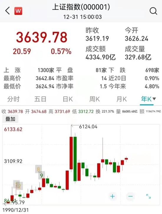 截至12月31日收盘,A股主要指数年线多数飘红。上证指数报3639.78点,全年上涨4.80%;深证成指报14857.35点,全年上涨2.67%;创业板指报3322.67点,全年上涨12.02%;科创50指数报1398.19点,全年上涨0.37%。