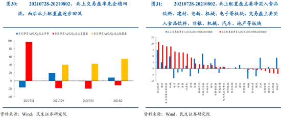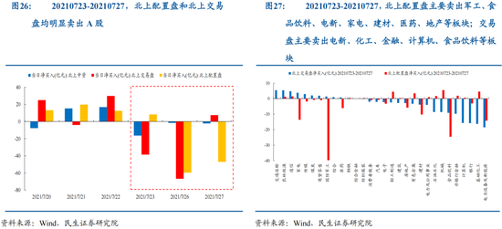 基本面情况与市场特征:7月23日,针对教育行业的“双减”政策落地,随后针对互联网领域的反垄断调查的持续发酵,A股在三个交易日(0723-0727)内出现了明显的调整,值得一提的是,A股中以居民和大众为最终购买方的板块(白酒、医疗服务、游戏、房地产和保险等板块是代表)在此过程中领跌市场。对于北上资金而言,无论是偏长线的配置型资金还是波动较大的交易型资金,在此区间内均出现明显卖出,其中,偏长线的配置型资金行为的边际变化更值得关注,北上配置盘主要卖出军工、食品饮料、电新、家电、建材、医药、地产等板块,这与上述领跌板块的重合度较高。交易层面看,北上资金的流出无疑是该区间内的市场的重要关注。