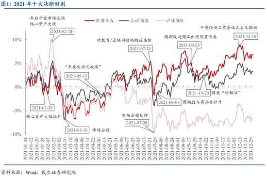 2021年有很多波动的时刻值得铭记,对于全市场投资者而言,都曾在以下时刻承受着不同程度的煎熬或者享受着未有的喜悦:(1)时刻一:1月29日。核心资产的“冲顶”与“跨过”香江去。(2)时刻二:2月18日。年后开盘,市场见顶,核心资产大跌,传统行业逆势上涨。(3)时刻三:3月10日。市场在年后暴跌之后开始逐步企稳。(4)时刻四:5月13日。政策对大宗商品调控,商品与周期股迎来“回头时刻”。(5)时刻五:7月23日。对于教育、互联网领域的反垄断,市场大跌。(6)时刻六:7月28日。市场在大跌之后企稳反弹。(7)时刻七:8月3日。周期股和商品开启了年内最强的一轮行情。(8)时刻八:9月23日。动力煤突破历史新高,但煤炭股却见顶回落,周期股与商品开始出现明显背离。(9)时刻九:10月20日。政策调控之下周期股与商品大幅下挫,大消费+TMT(元宇宙)+新能源上涨。(10)时刻十:12月10日。中央经济工作会议落幕,市场并无躁动。