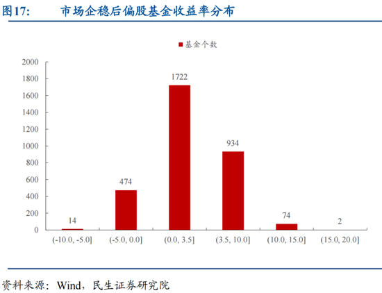 而彼时对于消费与新能源而言,在经历了年后的急跌与4月份的震荡后,疫情前的极致的估值分化已实现了一定收敛,消费类资产尚有需求复苏不及预期与疫后居民可支配收入下滑的风险,而新能源板块依然维持了较高的相对景气度,因此在估值得到部分消化与周期板块受政策调控影响出现分歧以后,在彼时具备较高的配置价值。而从后视镜的视角来看,当时也是新能源新一轮行情启动的起点,从基金表现来看,自5月14日后的一个月,偏股型基金指数上涨6.81%,有179只基金的收益率达15%以上,主要以布局新能源产业链为主;而在收益率排名靠后的基金中,消费主题占据多数。
