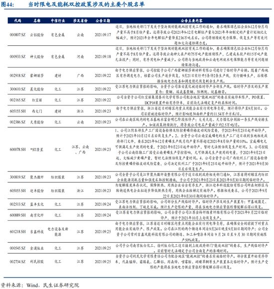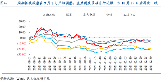 判断逻辑:随着限电及能耗双控的严格推进,市场正在表达对于周期板块的下游需求的担心,认为价格的上涨是不可持续的,这种担忧一方面来源于高涨的上游原材料价格已经很大程度挤压了下游利润,另一方面来源于“能耗双控”和“限电”本身也会使下游的开工走弱。同时,市场也担心周期股的产能也被限制住,导致“价升但量减”的局面,实际上在当时确实存在部分上市公司由于限电而被停产的情形。